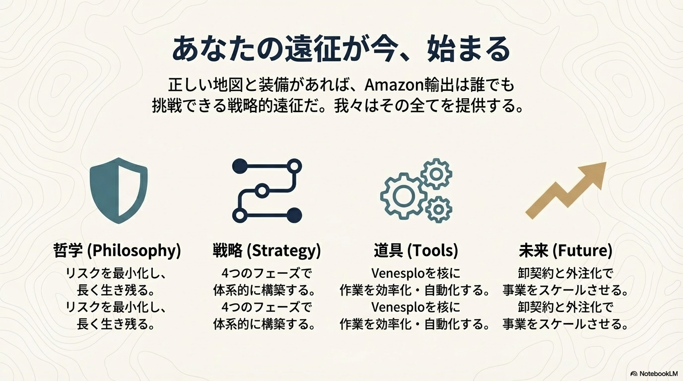 本講座は、個人または法人に対して、Amazon.comでの販売手法をデジタル教材とSNSでの双方向のやり取りを通じて提供するサービスです。本講座受講期間中は当社開発Amazon在庫管理ツール「Venesplo」を無料で利用できるものとします。